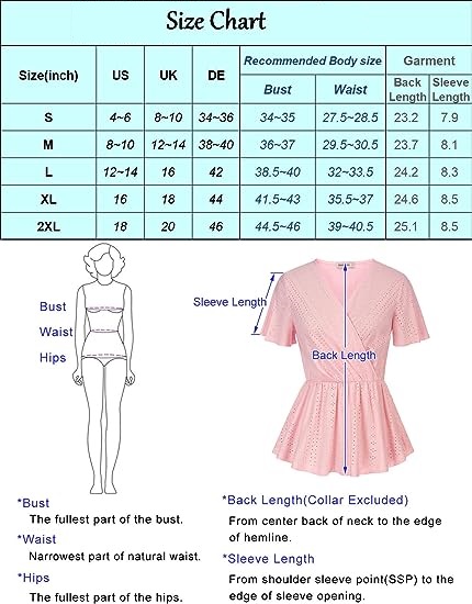 【Unique Feature】The stylish summer t shirts for women designed with crochet eyelet, elegant eyelet material makes this ruffle sleeve peplum top more trendy and elegant.Wrap v neck, ruffle short sleeve, elastic waist, pleated design is never out of date.